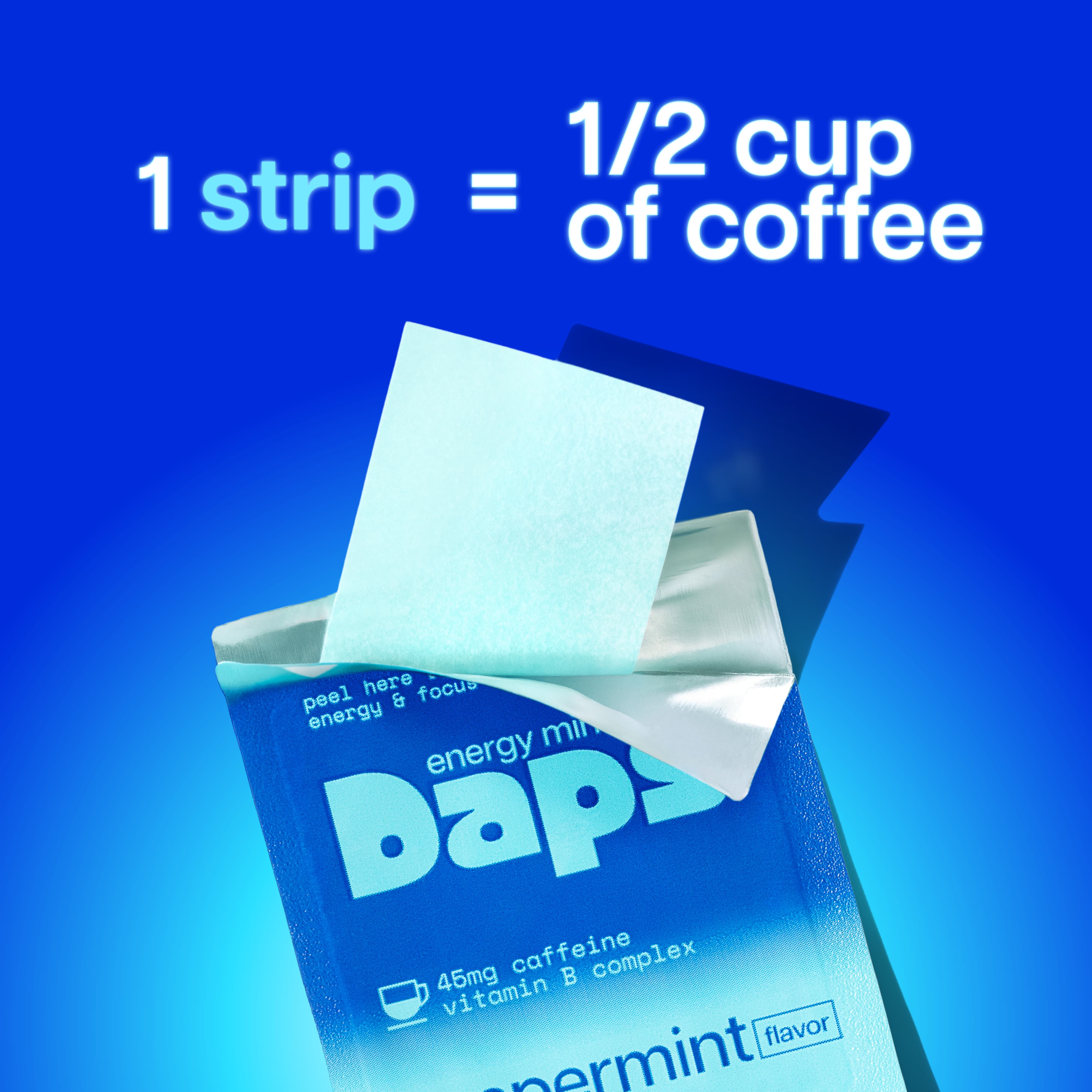 Each strip delivers 45mg of natural caffeine + essential b-vitamins. We like to compare one strip to half a cup of coffee worth of caffeine.